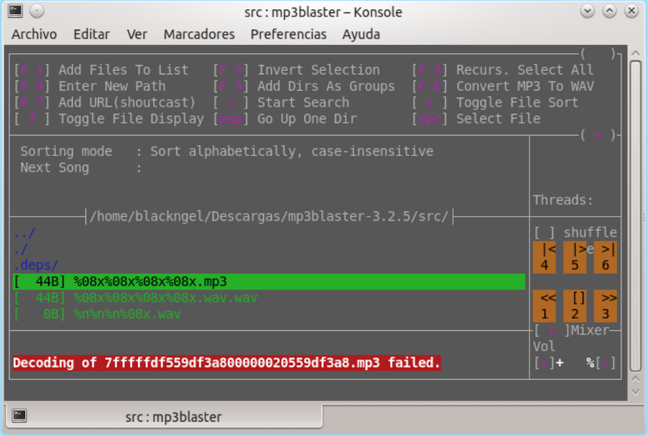 selItems [i] contiene il nome del file che l'utente desidera convertire. Il bug può essere riprodotto come segue: viene creato un file chiamato "% n.mp3" vuoto, e F1 viene premuto all'interno di mp3blaster per selezionarlo, quindi premere F6 per richiamare la funzione di conversione, il programma si applicherà per una directory WAV a salva il file convertito, premi ENTER et voilà!